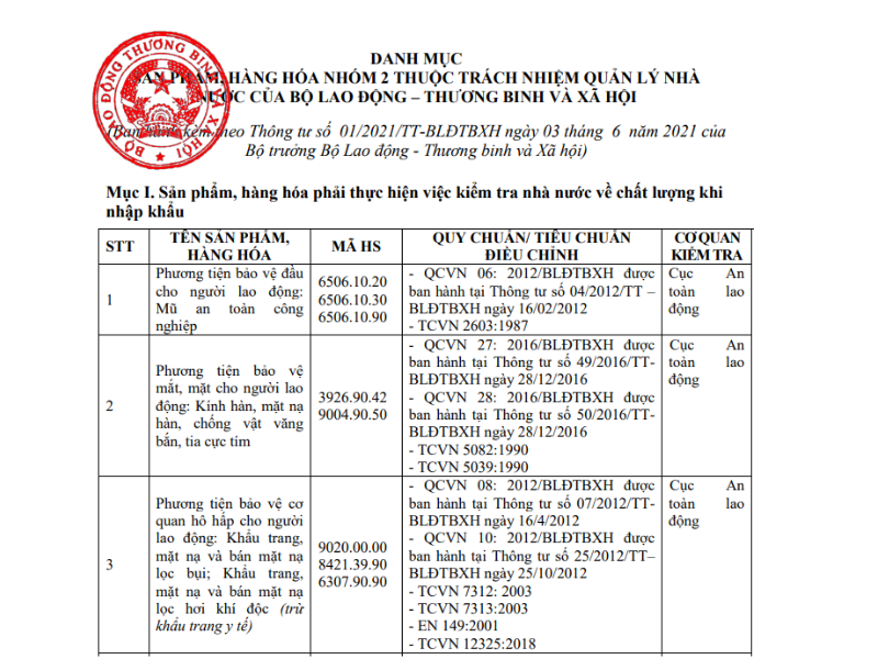 => Thông tư này sẽ thay đổi theo từng thời kỳ, bạn hãy tìm thông tư mới nhất đang áp dụng ở năm hiện để kiểm tra cho chính xác nhé. Năm 2023 có những mặt hàng thuộc diện kiểm tra nhà nước của Bộ lao động thương binh và xã hội nhưng đến năm 2024, 2025 có thể bãi bỏ mặt hàng đó khỏi danh mục này.